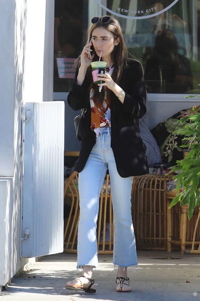 Với công thức áo blazer đen + quần jeans xanh quen thuộc, Lily Collins diện bên trong một chiếc áo thun họa tiết để tăng thêm vẻ nổi bật, cá tính.