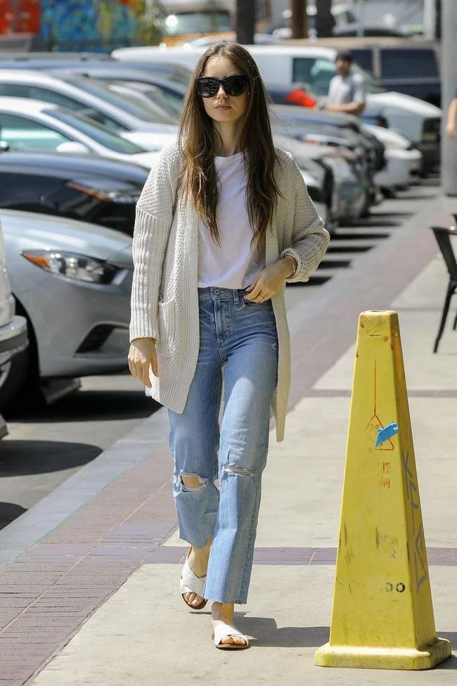 Cách đơn giản nhất để diện kiểu áo cardigan mùa thu chính là kết hợp với áo thun trắng và quần jeans. Chị em cũng đừng quên sơ vin để hack dáng như nàng Emily nhé.