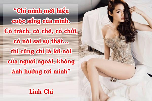 Ngoài Instagram, Linh Chi cũng thoải mái cởi mở trong ngôi nhà Facebook. Người tình của Lâm Vinh Hải tự nhắn nhủ bản thân trước ồn ào của mối tình bị cho là sai trái: "Anh đẹp trai, em thì đẹp gái... mình đến với nhau có gì là sai. Chỉ mình mới hiểu mình và cuộc sống của mình. Đã là người ngoài thì không bao giờ có thể hiểu rõ mọi chuyện được.