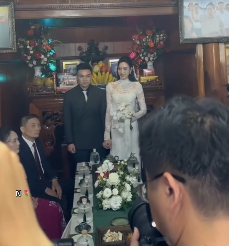 Theo đúng lịch trình, hiện cặp đôi đã về đến quê nhà chú rể ở Quảng Trị và thực hiện lễ gia tiên. Mới đây, trên mạng xã hội, xuất hiện đoạn clip cô dâu chú rể có mặt tại nhà thờ gia tiên để làm lễ và chào hỏi họ hàng, quan khách.