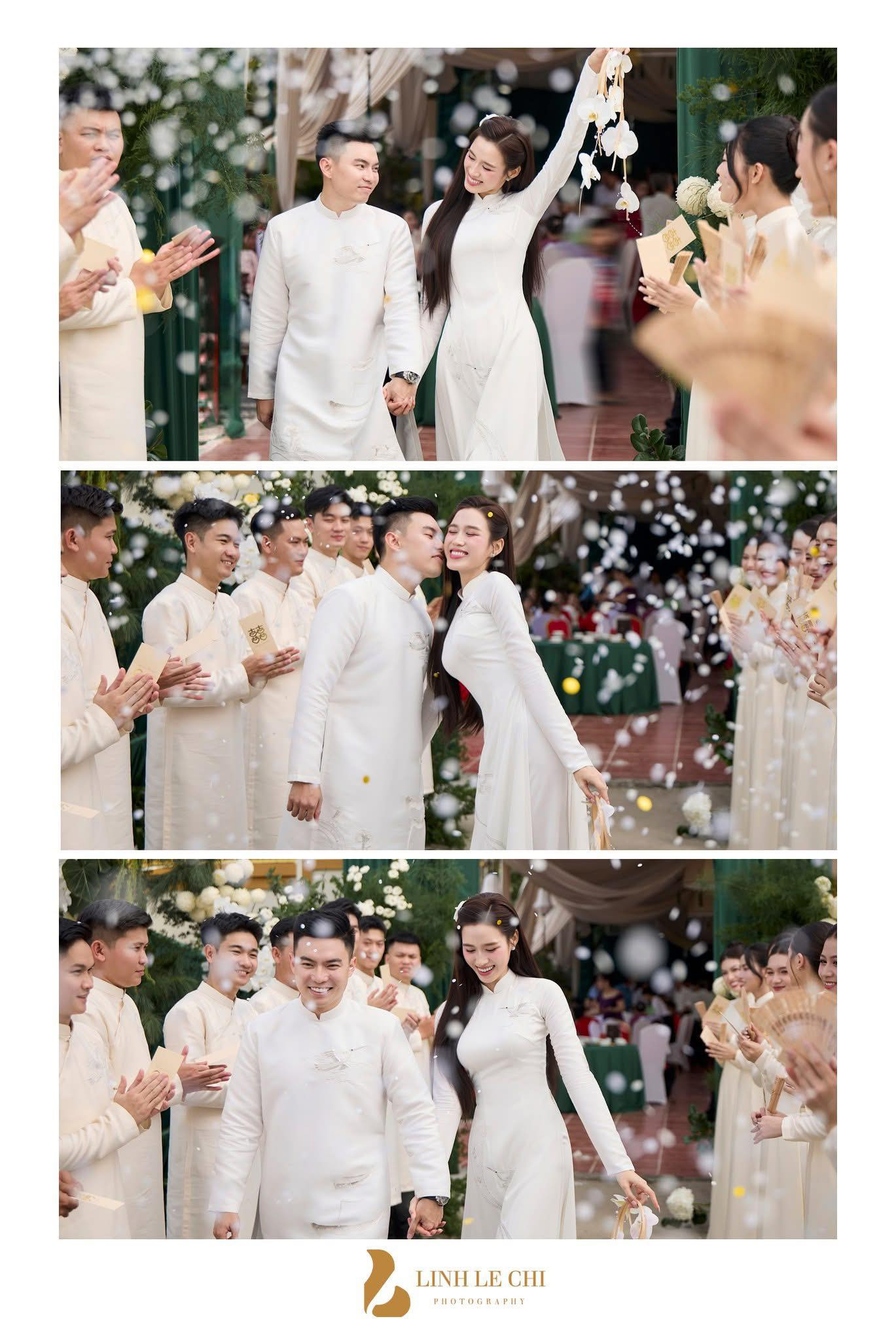 Dù lấy chồng đại gia nhưng Đỗ Thị Hà khá giản dị. Từ đám hỏi, người đẹp diện áo dài trắng, trang điểm nhẹ nhàng và để tóc xõa đơn giản nhưng vẫn toát lên được khí chất sang xịn, chuẩn dâu hào môn. Chân dài còn được khen tinh tế khi luôn sử dụng giày đế bằng để không bị chênh lệch chiều cao so với ông xã.