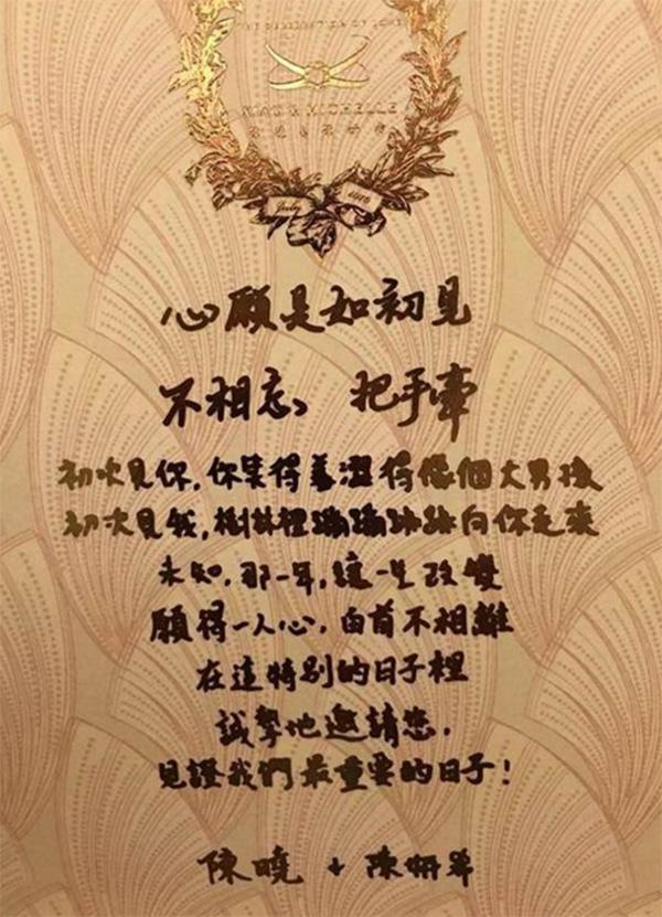 Vào ngày 19/7 tới đây, cặp đôi "Tiểu Long Nữ - Dương Quá" Trần Hiểu và Trần Nghiên Hy sẽ chính thức tổ chức hôn lễ tại Bắc Kinh. Được biết toàn bộ đám cưới đều là ý tưởng của Trần Nghiên Hy, cô thích tổ chức vào mùa hè, vì không chịu được cái lạnh mùa đông, người đẹp cũng lấp lửng việc tổ chức đám cưới trong nhà thờ hoặc ngoài bờ biển, tuy nhiên vì hai bên gia đình đều đã cao tuổi không thể đi lại nhiều, chính vì vậy cặp đôi sẽ tổ chức đám cưới ở cả hai địa điểm Bắc Kinh và Đài Bắc.