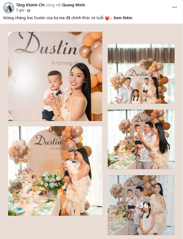 Người đẹp đăng hình kèm dòng trạng thái: "Mừng chàng trai Dustin của ba mẹ đã chính thức có tuổi. Buổi tiệc nhỏ nhỏ ở nhà ấm cúng vui vui cùng gia đình và mấy cô chú “pick thủ” của ba mẹ."