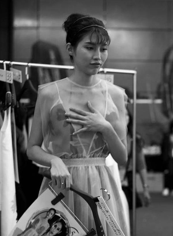 Trong hậu trường, Quỳnh Châu phải lấy tay che chắn vòng một để tránh gặp sự cố "lộ hàng".