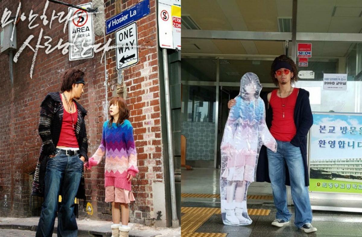 Anh chàng không ngại hóa thân thành So Ji Sub trong bộ phim truyền hình “I’m Sorry, I Love You” (Xin lỗi anh yêu em) với banner của nữ chính bên cạnh