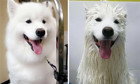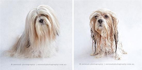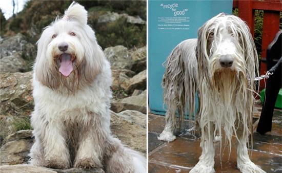Trái lại với vẻ tiểu thư, đài các thường ngày, sau khi tắm chú chó này có phần trông