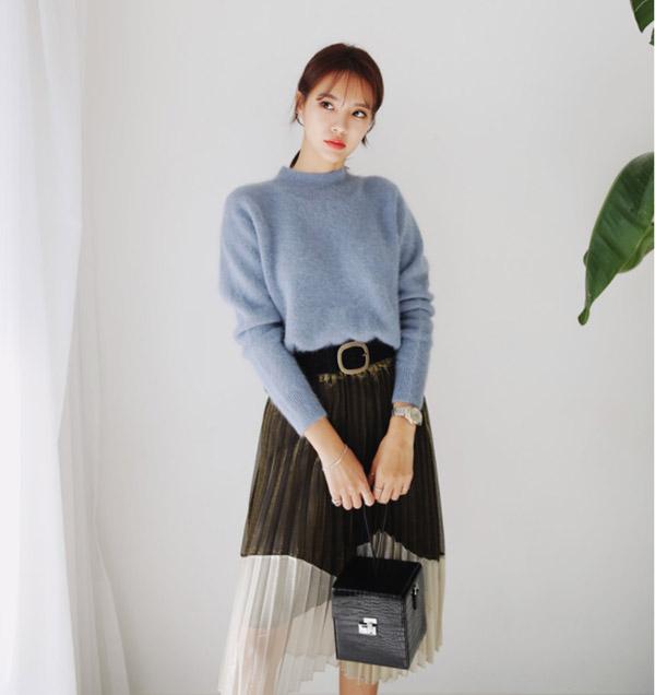Hoặc các quý cô cũng hoàn toàn có thể lựa chọn cách sơ vin áo len mỏng dáng ôm cùng chân váy midi,