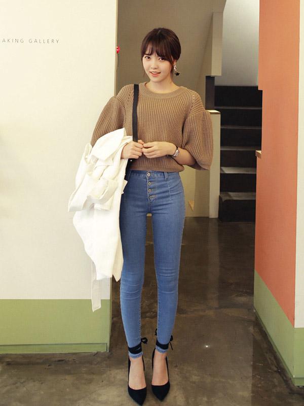 Áo len cộc tay kết hợp cùng quần skinny jeans và giày cao gót vừa đơn giản, thoải mái lại vừa năng động...