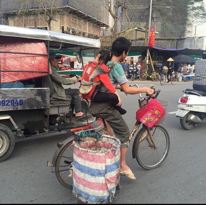 Hình ảnh người cha địu con trên lưng đạp xe đi nhặt rác ở Long Biên từng khiến dân mạng cảm động (Ảnh: Internet)