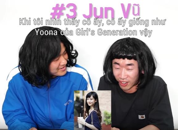 Chàng trai mặc áo đen phấn khích, tự nhận Jun Vũ là mẫu người con gái anh yêu thích, không tiếc lời khen ngợi nhan sắc xinh đẹp của cô. Chàng trai bên cạnh lại thấy Jun Vũ giống ca sĩ Yoona của Girl's Generation.