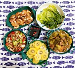 Bữa ăn ngon lành với cà ri gà, bắp cải cuốn thịt hấp, cà tím nướng mỡ hành, canh sườn non dưa chua và tráng miệng táo nam phi mini.
