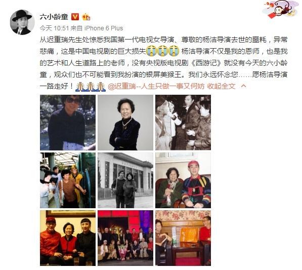 Lục Tiểu Linh Đồng chia sẻ: "Nghe tin dữ từ Trì Trọng Thủy tiên sinh, nữ đạo diễn đầu tiên của nước ta - Dương Khiết, người mà tôi vô cùng tôn kính đã qua đời, một mất mát vô cùng to lớn với nền điện ảnh Trung Quốc. Đạo diễn Dương Khiết không chỉ là ân sư, mà còn là người thầy dẫn lối tôi đi trên con đường nghệ thuật. Không có Tây Du Ký của ngày ấy sẽ không có Lục Tiểu Linh Đồng tôi ngày hôm nay. Chúng tôi sẽ mãi nhớ đến bạn. Đạo diễn Dương Khiết đi mạnh khỏe".