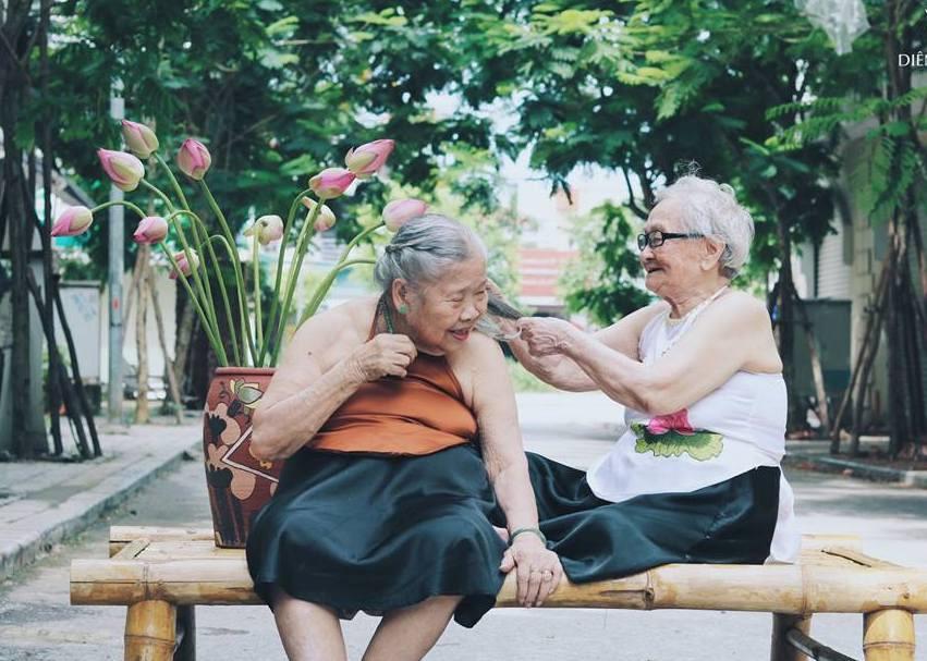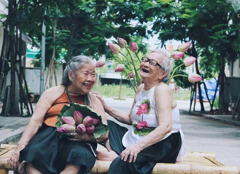 Bộ ảnh về tình bạn của hai cụ bà tạo dáng xì-tin bên hoa sen đang được chia sẻ trên mạng khiến nhiều người thích thú. Điều đặc biệt là 2 cụ bà ở tuổi "thất thập cổ lai hy", song vẫn mặc áo yếm tạo dáng trẻ trung, đáng yêu trước ống kính.