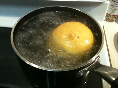 - Đổ 2 lít nước vào nồi, đun sôi lên. Đến khi nước sôi, bạn thả nguyên quả bưởi vào rồi đun thêm chừng 3 phút.