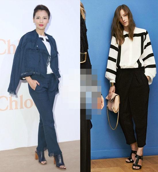 Cô chọn chiếc áo trắng đen của hiệu Chloe để mix cùng bộ đồ xanh.