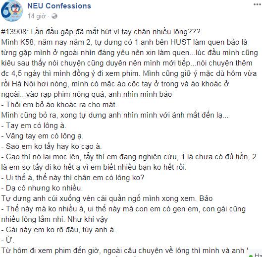 Câu chuyện vừa được đăng tải trên trang mạng xã hội NEU Confessions với chủ đề "lần đầu gặp đã mất hút vì tay chân nhiều lông" được chị em ủng hộ nhiệt tình. Nhiều người tỏ ra phê bình người con trai trong câu chuyện vì anh chàng này quá vô duyên khi đã phũ phàng với cô gái xinh đẹp như vậy.