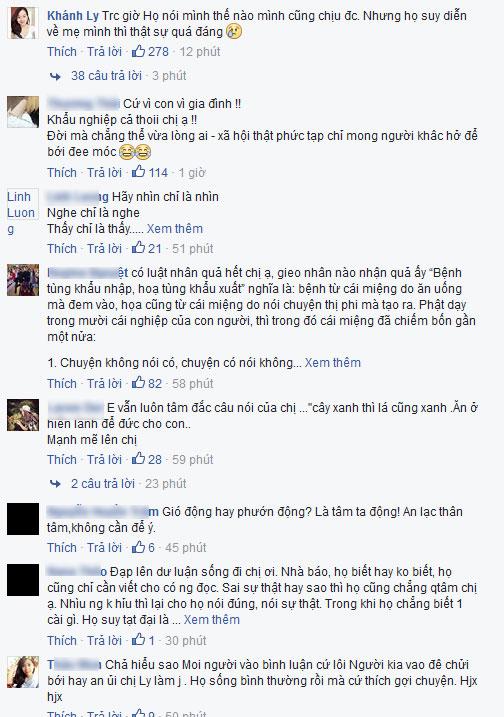 Sau khi Ly kute đăng tải chia sẻ này, nhiều bạn đã vào động viên Ly kute hãy mạnh mẽ và buông bỏ: "Là người ngoài em luôn theo dõi và mến mộ mẹ con chị .Em cũng thấy bức xúc thay cho chị. Chỉ là muốn thể hiện cảm xúc của 1 người làm mẹ, làm bà mà báo chí cứ giật tít, câu view, tự do phát ngôn hộ người khác mà không nghĩ rằng đó là xúc phạm người khác."