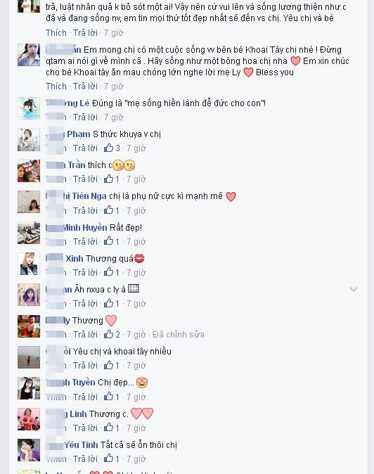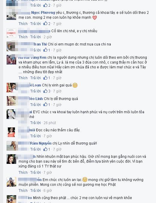 Những dòng chia sẻ và bài học quý giá mà Ly kute đăng tải nhanh chóng nhận được nhiều phản hồi của bạn bè và fans. "Con trai hưởng đức của mẹ ,có người mẹ hiền lành nhân hậu như chị ,bé yêu của chị may mắn biết bao"; "Mẹ quan âm từ bi sẽ che chở cho Ly và Tây nhé"; "Luôn tự nhắc mình sống thiện sống đúng sống theo lời Phật dạy;" "Tôi thật mong bạn một lần đến chùa Hoằng Pháp ở Hồ Chí Minh để cảm nhận nguồn năng lượng tâm linh ấm áp nơi ấy, những nỗi đau sẽ lành, mầm thiện sẽ càng mạnh mẽ sinh sôi cho ngày sau, ắt hẳn tâm sẽ càng yên và phước sẽ thêm đầy."