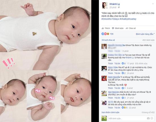 Mới đây nhất, trên trang cá nhân của mình, Ly kute đăng tải hình ảnh bé Khoai Tây ngày tròn 3 tháng 10 ngày nhanh chóng nhận được bão like. Ly kute xem con trai như một người bạn thân thiết, cô nàng xưng "chị" với con trai rất dễ thương: "Hôm nay mình hết cữ rồi, không biết chị Ly kute có cho mình đi đâu chơi không ta?"