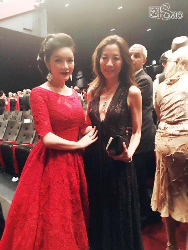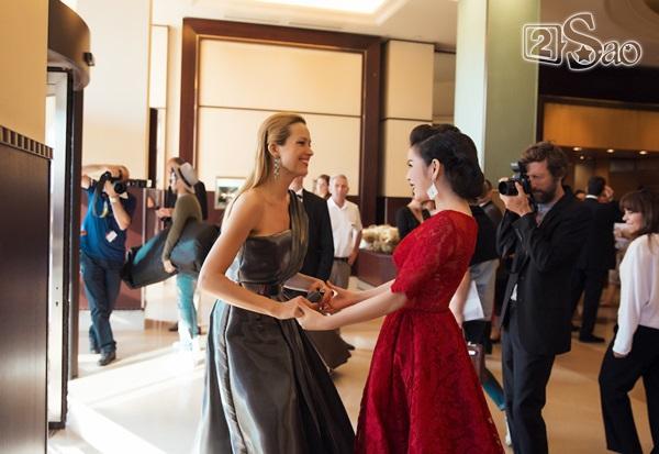 Cả hai dành cho nhau những cái ôm thắm thiết mừng ngày gặp mặt và tíu tít trò chuyện. Cả hai người từng “hẹn hò” sẽ gặp gỡ tại LHP Cannes khi tham dự sự kiện thiện nguyện gây quỹ nghiên cứu phòng chống AIDS với sự quy tụ các sao và tỉ phú hàng đầu thế giới tại Hồng Kông cách đây ít lâu, cuộc gặp gỡ tại khán phòng này là mối duyên bất ngờ thú vị.