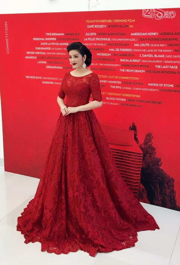 Trong ngày thứ 4 đến với sự kiện Cannes 2016, Bộ đầm ren đỏ Haute couture của Georges Hobeika được thiết kế với phom dáng cổ điển, tùng váy xoè phồng cùng vòng eo ôm sát,