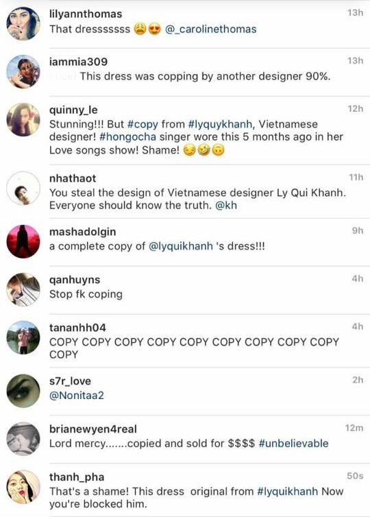 Giữa ồn ào, Hồ Ngọc Hà đã lên tiếng bảo vệ Lý Quí Khánh và thề rằng chiếc váy của đàn em không phải là sản phẩm đi học hỏi. Đông đảo khán giả trong nước và quốc tế cũng đứng về phe NTK Việt Nam, sử dụng nhiều bình luận và "hashtag" phản đối màn "ăn cắp" ý tưởng của thương hiệu Reem Acra.
