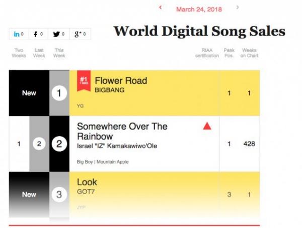 Flower Road không phải ca khúc đầu tiên từ BigBang đứng đầu World Digital Song Sales Chart. Trước đó, Let’s Not Fall in Love, Bang Bang Bang, Loser, Good Boy cũng từng dẫn đầu BXH này của Billboard.