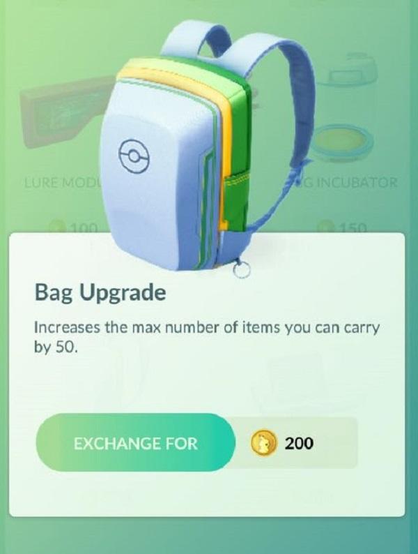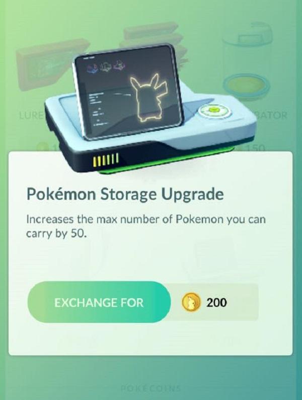 Túi đựng Pokemon: Mỗi lần mua thì sẽ đựng thêm được 50 con Pokemon, nếu không cần thiết thì không cần mua cái này. Những con yếu và nhiều thì mấy bạn nên Transfer để bớt chật chỗ vào có thêm kẹo để tiến hoá.