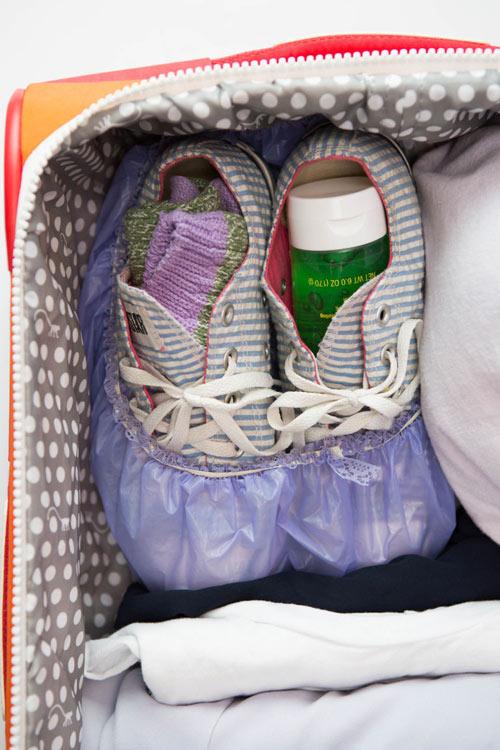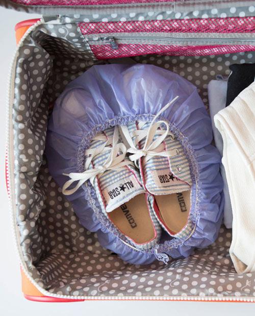 2. Mũ nilon trùm đầu khi tắm sẽ túm gọn đôi giầy xinh xắn của bạn lại, ngăn không cho chúng dây bẩn sang các vật dụng khác trong túi đồ.