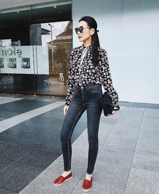 Thanh Hằng có niềm đam mê với áo sơ mi họa tiết kết hợp quần skinny
