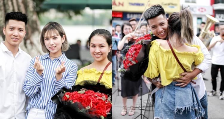 Theo đúng kế hoạch, chàng trai hẹn gặp bạn gái tại phố đi bộ Hồ Gươm. Sau đó, nam chính đưa người yêu đến đám đông được chuẩn bị từ trước rồi bất ngờ "mất tích".