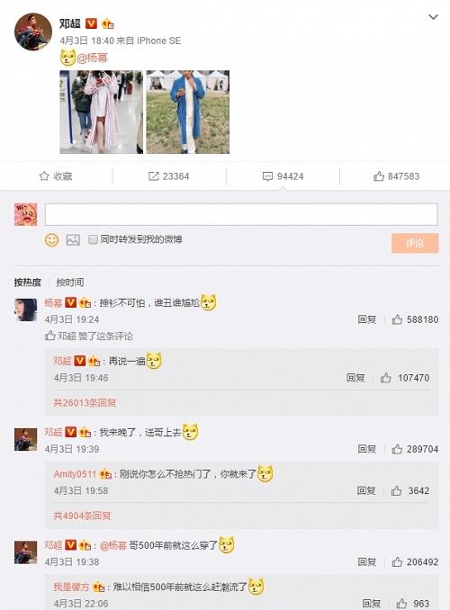 Ông xã Tôn Lệ cũng không phải dạng vừa khi “trả treo”: “Cho nói lại lần nữa. Anh mặc đồ thế này từ 500 năm trước rồi nhé”. Đặng Siêu còn không quên hóm hỉnh nhắn nhủ cư dân mạng: “Anh tới chậm rồi, mau đưa anh lên top (Weibo). Đứa nào xấu đứa đấy biết”.