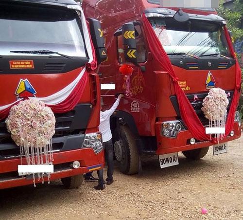 Với anh, hai chiếc Howo A7 màu đỏ rất phù hợp với không khí của một đám cưới. Gia đình đã trang trí lên đó vòng hoa hồng, cùng dải ruy băng, bong bóng và lồng đèn.