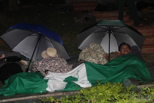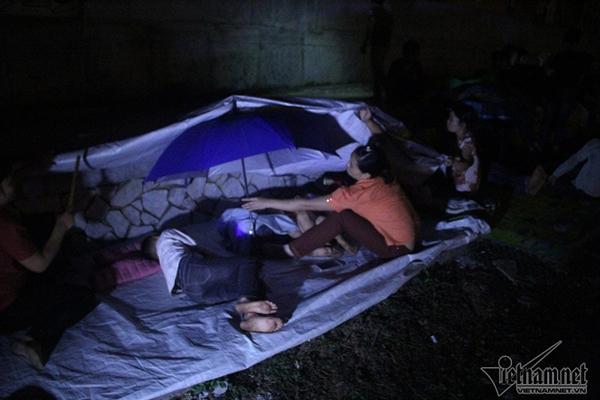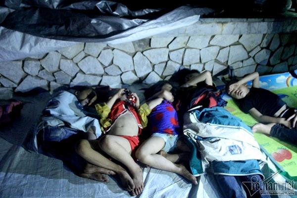 Gia đình anh Hà Văn Kim (Xuân Sơn, Phú Thọ) đi hơn 70km để đến đây. Trẻ con trong gia đình anh Kim ngủ ngon lành trên tấm bạt trải dưới đất.