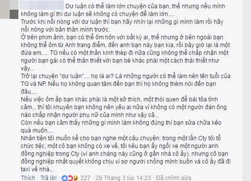 Trường Giang nếu có thần kinh thép đi nữa cũng không thể chấp nhận người bạn gái có thể thân thiết với bạn bè khác phái một cách tha thiết như vậy", một fan gửi lời đến Nhã Phương.