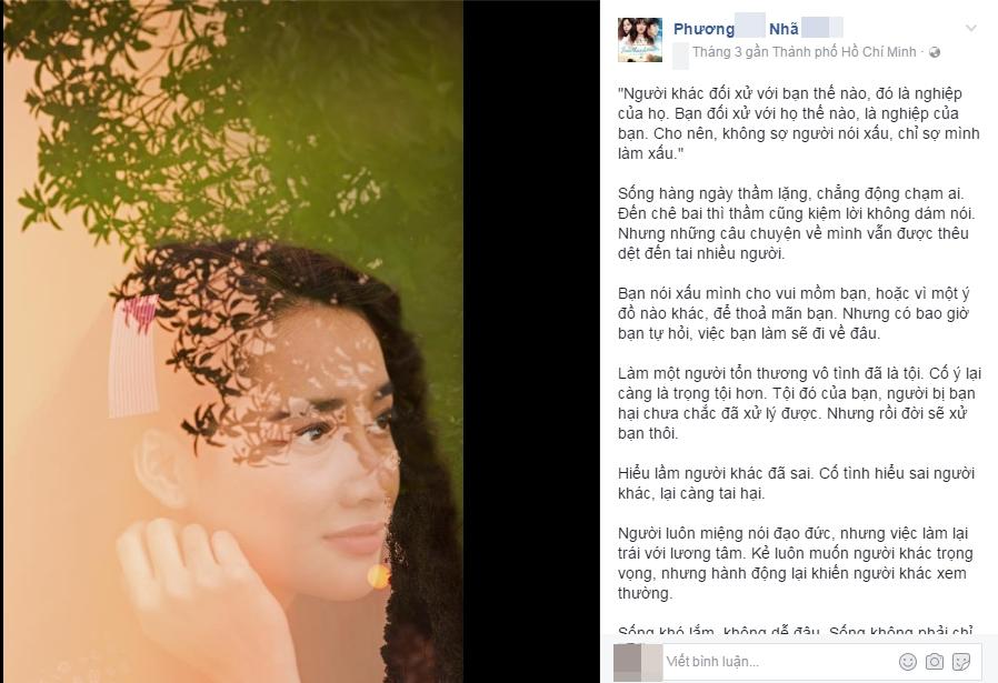 Dòng tâm thư của Nhã Phương giữa ồn ào đã nhanh chóng thu hút sự chú ý. Ngoài lời cảm thông, nhiều facebooker cũng gay gắt: "Dư luận có thể làm lớn chuyện của bạn, nhưng nếu mình không làm gì thì dư luận sẽ không có chuyện để làm lớn. Trước khi nổi nóng với dư luận, bạn hãy nhìn lại những gì mình làm rồi hãy nổi nóng với bản thân mình trước. Trở lại chuyện dư luận... Họ là ai? Là những người làm nên tên tuổi của Trường Giang và Nhã Phương. Nếu họ không quan tâm đến bạn, họ không thèm nói đến bạn đâu".