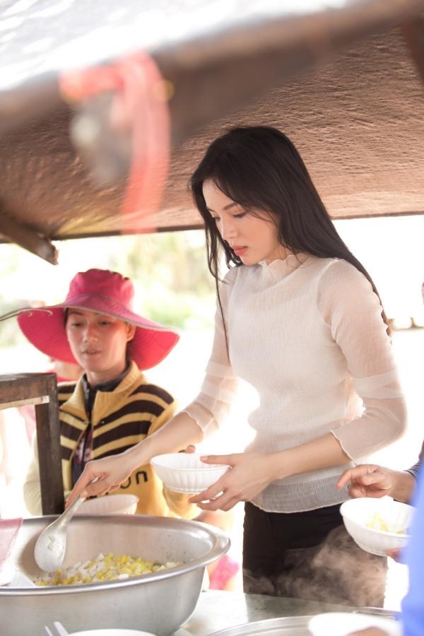 Đặc biệt, sau buổi sáng làm việc ý nghĩa, Hoa hậu còn đích thân chuẩn bị bữa trưa cho mọi người. Giữa khí hậu nắng nóng gần 40 độ của vùng biên giới phía Nam, cô vẫn hào hứng cùng với anh em trong đoàn vào bếp để chuẩn bị gần 300 phần ăn trưa cho các em học sinh.