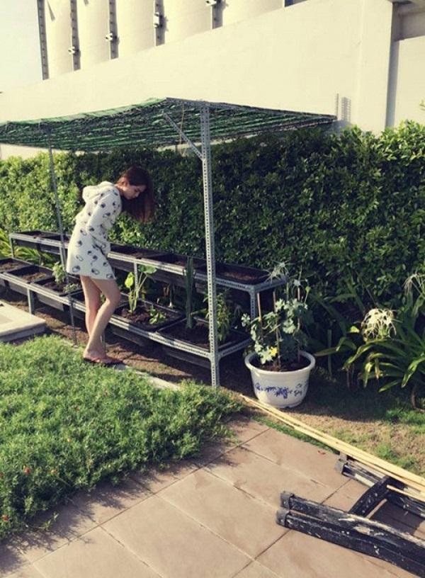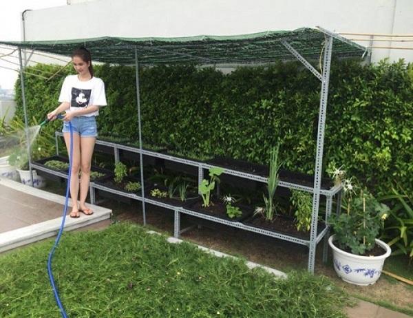 Vì không có nhiều thời gian nên việc chăm sóc cho vườn rau nhỏ của mình cô nhờ giúp việc. Nhưng khi rảnh rỗi cô lại lên tưới rau và ngắm cây, tận hưởng không khí trong lành.