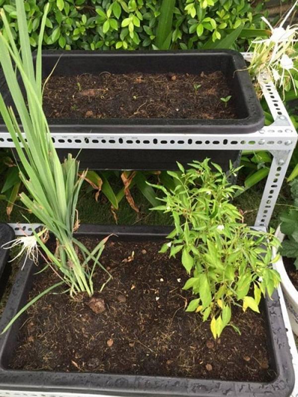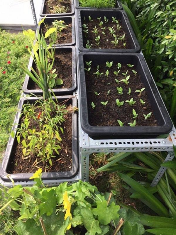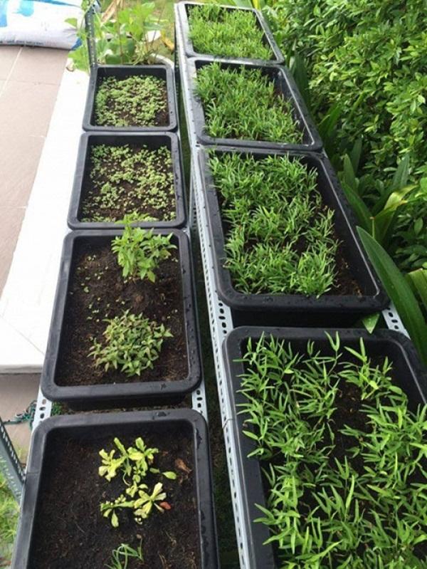 Không có nhiều kinh nghiệm trồng rau nên người đẹp nhờ người đến lắp đặt giá đặt khoảng hơn chục khay trồng rau. Chi phí lắp đặt vườn rau theo mô hình này hết gần 7 triệu đồng. Cô trồng các loại rau như rau muống, dền, diếp cá và một số loại cây gia vị khác.