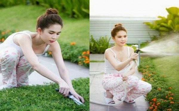 “Mình hay dậy sớm nên có vườn rau để chạy lên ngó mỗi sáng trước khi đi công việc cũng thấy vui. Đợi rau lớn, mình sẽ lên hái xuống nấu ăn. Mình ít ra chợ mua rau hay đồ ăn, rảnh rỗi lắm mới đi cùng hai người giúp việc", Ngọc Trinh cho biết.