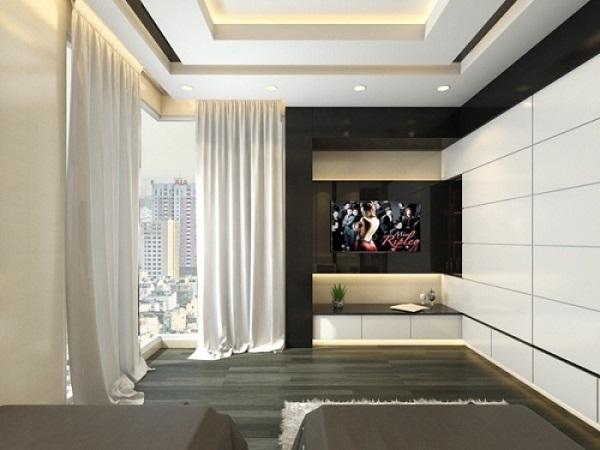 Không gian phòng ngủ rộng rãi, thoáng mát có cửa sổ rộng để ngắm nhìn phong cảnh thành phố mỗi sáng thức dậy.