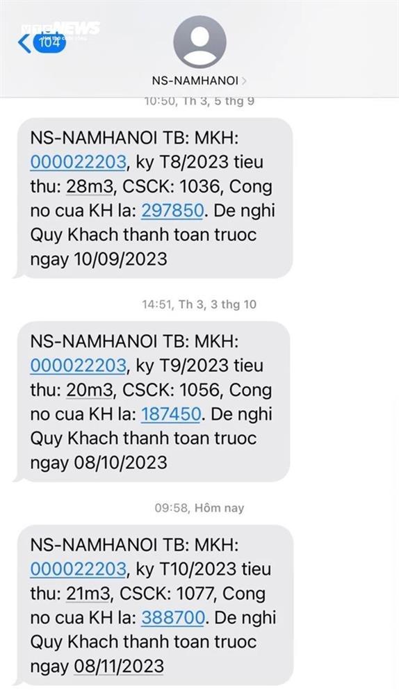 Điều đáng nói, dù tình trạng thiếu nước, mất nước kéo dài gần nửa tháng 10, khi có nước trở lại, cư dân ở đây cũng hạn chế đến mức tối đa trong việc sử dụng nguồn nước của Công ty Cổ phần nước sạch Thanh Hà, nhưng tiền nước trong tháng 10/2023 của nhiều hộ gia đình phải đóng lại tăng 2 - 3 lần, có gia đình tăng 6 lần so với tháng trước.