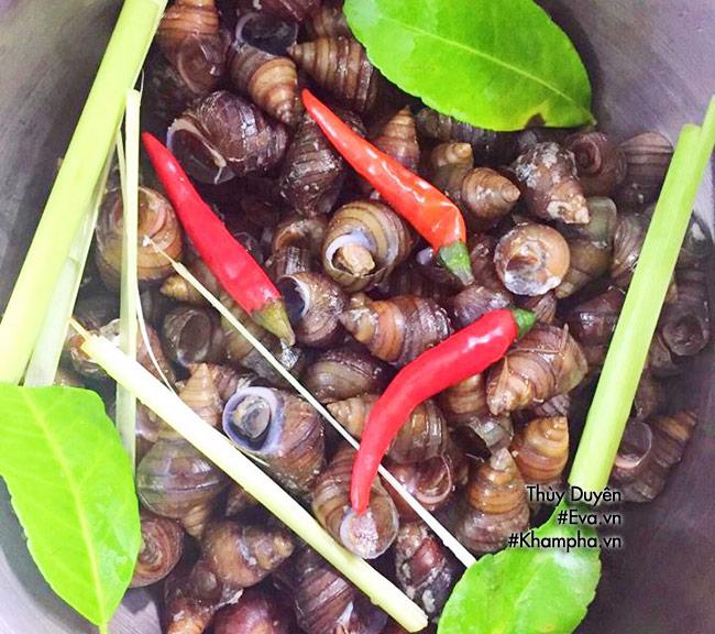 - Ốc sau khi rửa sạch, cho vào nồi, bỏ thêm lá bưởi (hoặc lá chanh), vài cọng sả, một chút xíu nước. Bản thân ốc đã chứa nhiều nước nên dù không cho thêm cũng không sợ cháy nồi.