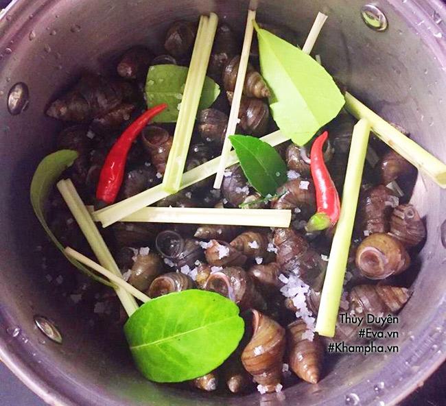 - Đậy vung, đặt nồi lên bếp đun đều lửa. Khi ốc sôi trào, lập tức mở vung, đảo lên một lượt, thấy vẩy bong đều là được. Thường ốc chín sau khi sôi khoảng 2 - 3 phút. Không nên đun lâu quá kẻo ruột ốc thụt vào trong và đứt đoạn, rất khó khêu.