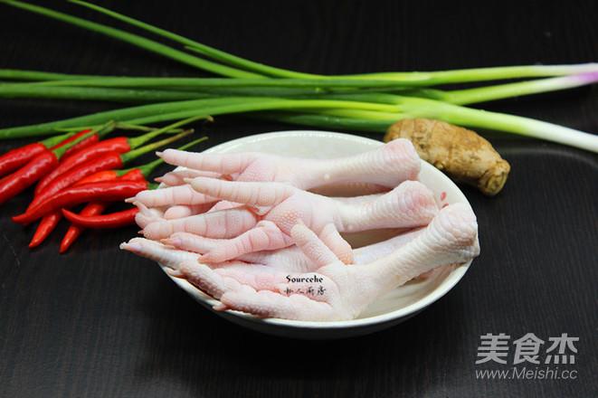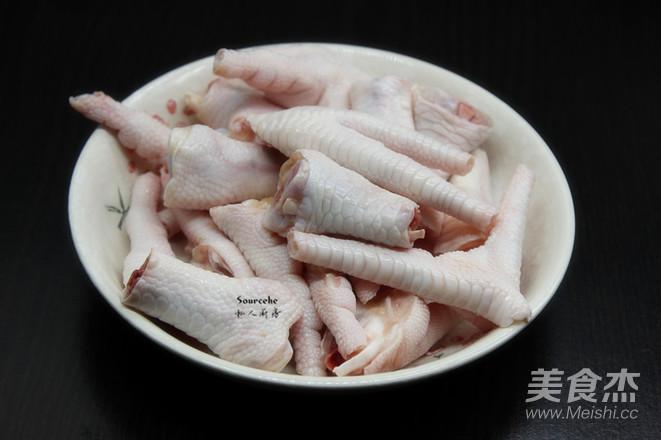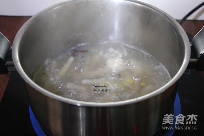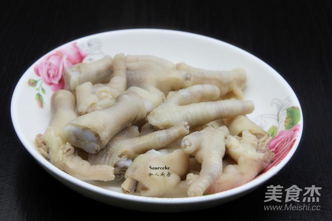 Bước 3: Luộc chân gà: Cho chân gà, gừng, rượu trắng, nước vào nồi đun sôi trong vòng 6 phút rồi vớt ra, để ráo nước.