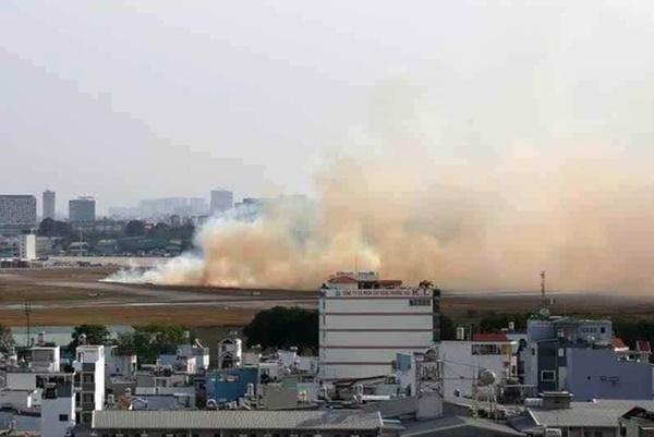 Sự cố khiến đám cỏ ở sân bay Tân Sơn Nhất bốc cháy tạo thành cột khói. Ảnh: Dien dan Hang khong.