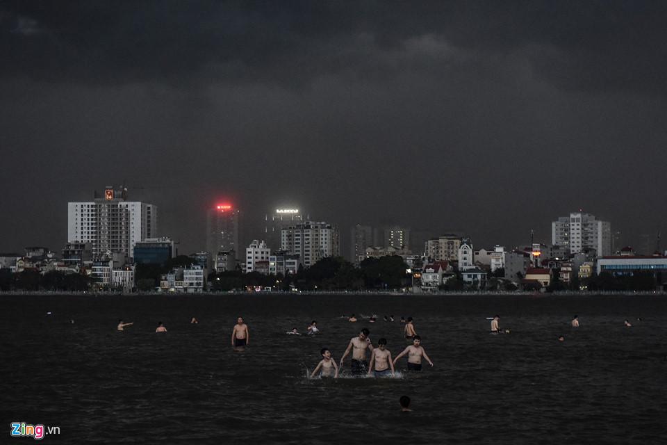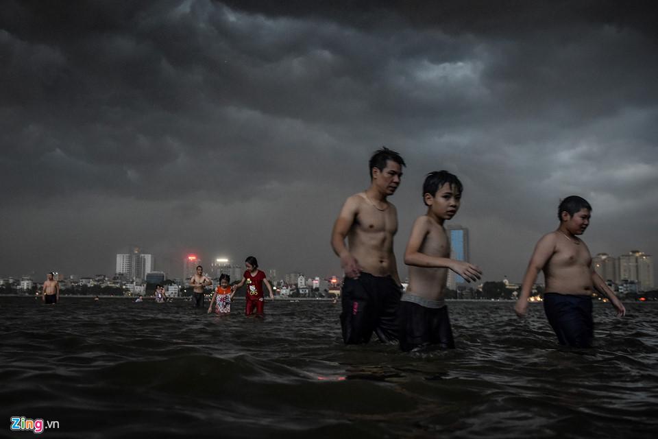 Cùng lúc đó tại khu vực bãi tắm hồ Tây, nhiều người đang đi giải nhiệt vì thời tiết nóng hơn 40 độ C ngày hôm nay đã phải vội vàng lên bờ.