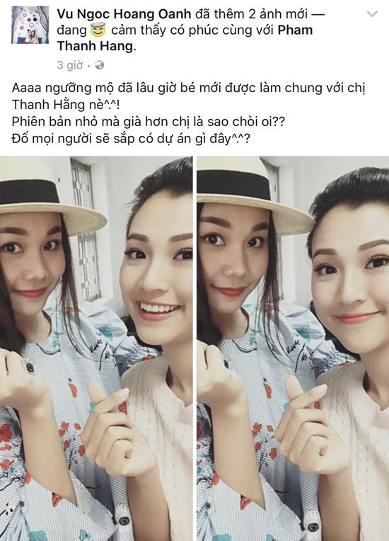 Trong khi đó, MC Hoàng Oanh cũng chia sẻ hình ảnh chụp chung với Thanh Hằng và bày tỏ sự ngưỡng mộ dành cho đàn chị. Cô cũng tiết lộ mình sẽ vào vai thời niên thiếu của nhân vật do Thanh Hằng đảm nhận.