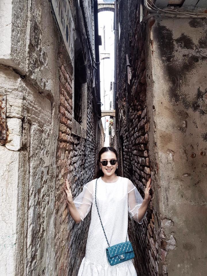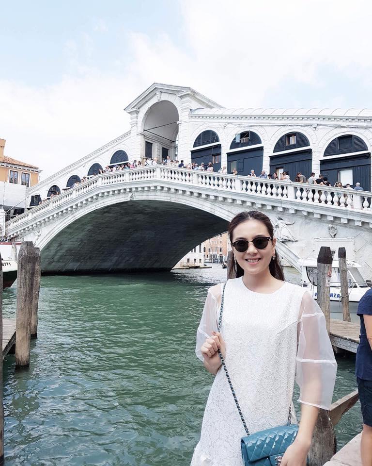 Mai Ngọc cũng chia sẻ dòng cảm xúc khá dài khi tới Ý: "Venice- Tiếng La Tinh "Tình Yêu". Venice không hào nhoáng với kiến trúc lộng lẫy. Nhưng với tôi lại có cái đẹp rất riêng của những ngôi nhà cũ, nhưng con phố bé tí chỉ một người qua, những con đường ngập nước, những mái chèo của anh lái thuyền người Ý (đẹp trai như trong tạp chí vậy)."