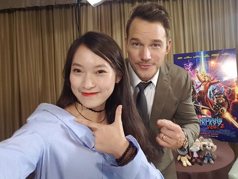 Kết thúc buổi phỏng vấn, Khánh Vy không quên gây ấn tượng với món quà đặc biệt là 2 câu rap dành tặng riêng tài tử Chris Pratt.